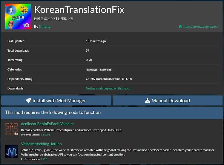 이전 버전 : 발헤임 모드 - [KoreanTranslationFix 1.0.0] 안개땅 문자열 쪼끔 업데이트 KoreanTranslationFix v1.1.0 맘에 안 드는 거 내 맘대로 수정 valheim.thunderstore.io