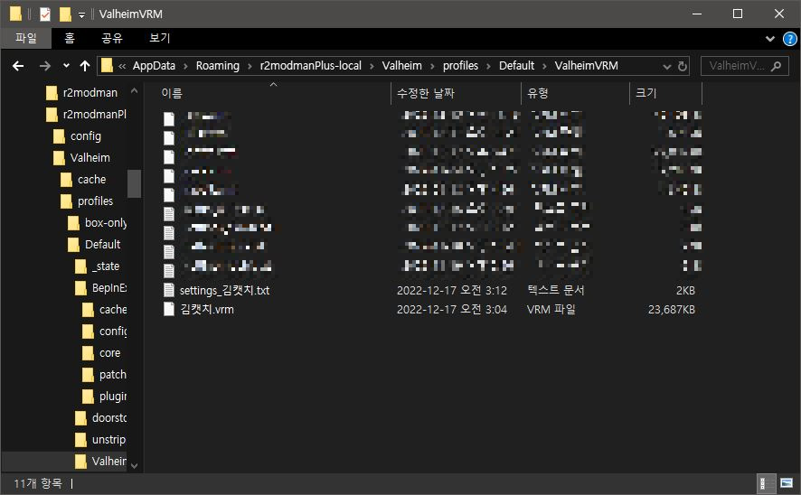 여기서 소개하는 모드는 다 번개가게 모드매니저 기준이니 이번에도 r2modman 기준으로 설명한다. 우선 위의 두 경로에 압축 파일 내의 ValheimVRM 폴더를 복사해서 붙여넣는다.